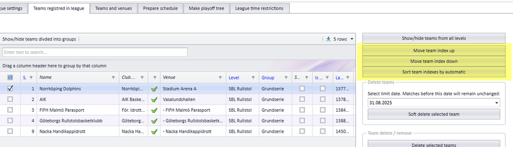 If the leaguelevel is using playkey, the teams must be indexed so they fit into the playkey list. This is done by positioning teams as shown in yellow.