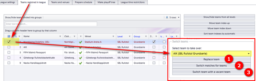 Replace or switch teams must always start with selecting team out in the team list (left side grid in image below) and select team in by the dropdown shown in the red rectangle. It is, of course, only possible to select one team from the team list! Teams can be selected undepending og category (or level) in a league.