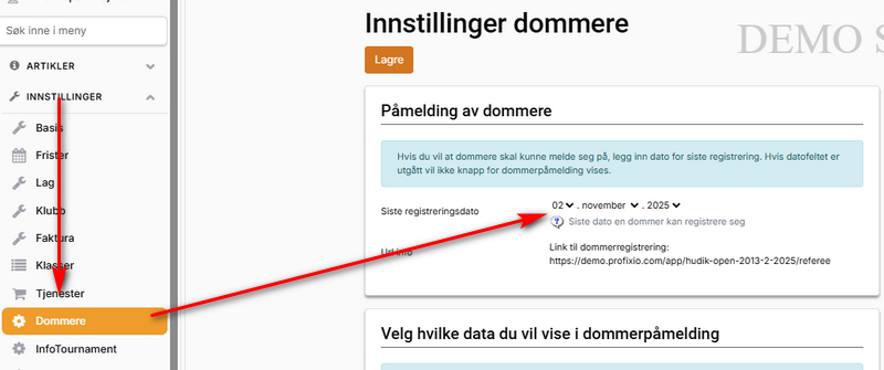 Det er en sluttdato for registrering som må være i fremtiden for at dommere skal kunne registrere seg. Hvis denne datoen er satt til fortid, kan IKKE dommere registrere seg i turneringen.