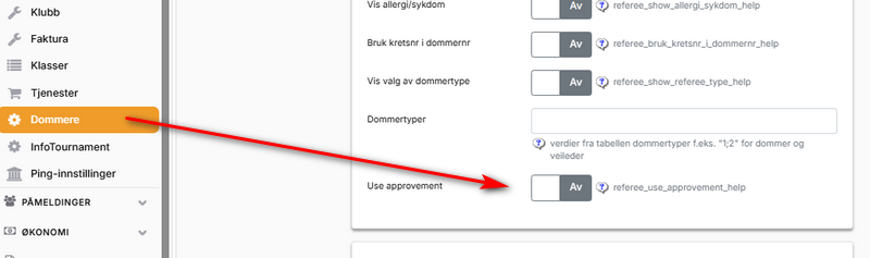 Hvis du ønsker å godkjenne dommere etter at de har registrert seg i turneringen, må du aktivere «Bruk godkjenning», se bildet under: