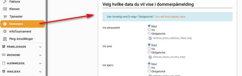 I Profixio finnes det mange innstillinger å velge mellom angående registrering av dommere. Disse innstillingene forklares av en hjelpetekst. Hvis du er usikker, kan du kontakte Profixio-support.