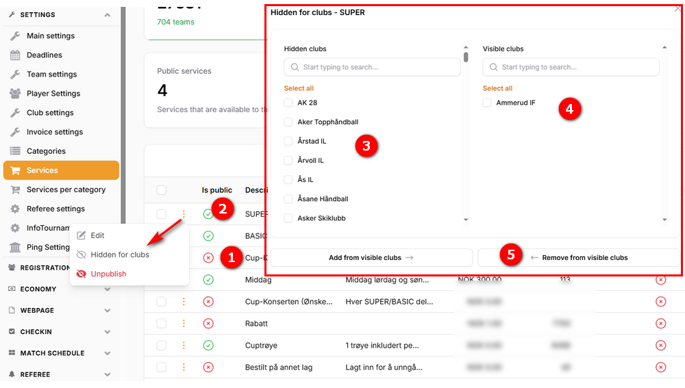 - ONLY services which are published can be set to be visible for teams to certain clubs. Unpublished services will not be shown to other than the tournament administrators.