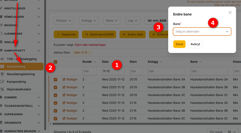 - ...og velg ny bane til kampene som er markert. Klikk "Send" for å lagre.