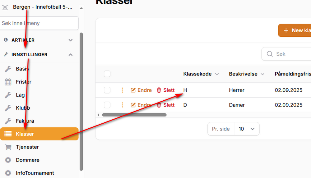 Kolonnen i Excel som heter klassenavn MÅ inneholde nøyaktig samme navn som klassekode i turneringsoppsett. Slik finner du klassekoden: