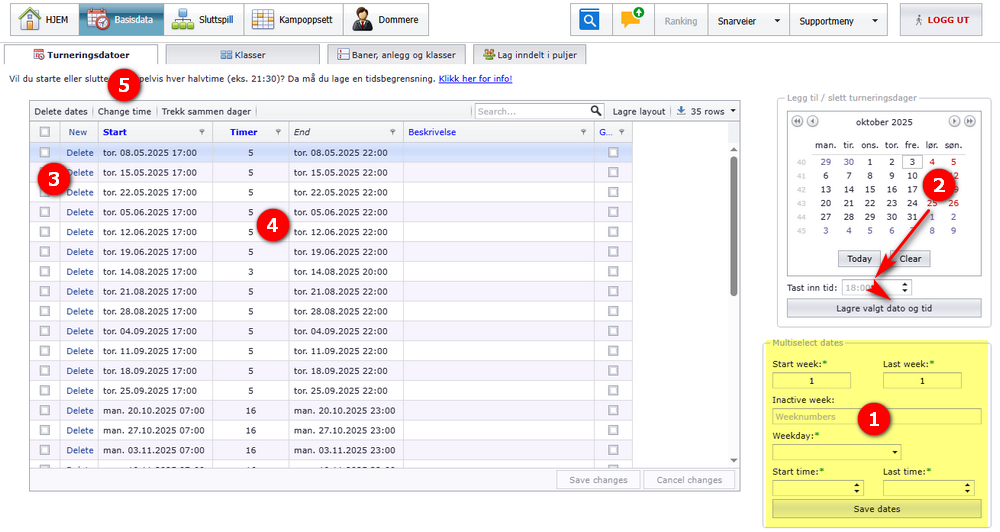 - Hvis man skal endre dato/klokkelsette på mange kamper, check-on kampene og klikk "Change time"