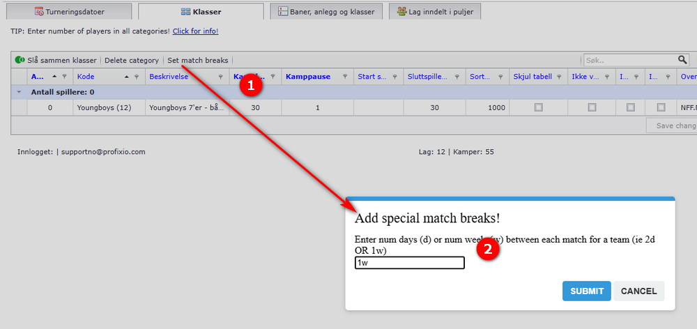 - Hvis ett lag MÅ ha pause ett visst antall dager, eventuelt skal KUN spille 12 kamp hver uke, bruk da "Set match break". Dette gir en begrensning på lag slik at de MÅ vente x dager/uke før neste kamp kan spilles