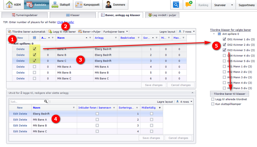 - Baner kan tilordnes klasser. Da vil systemet kun fordele kamper i klasse A på de baner som klasse A er tilordnet.