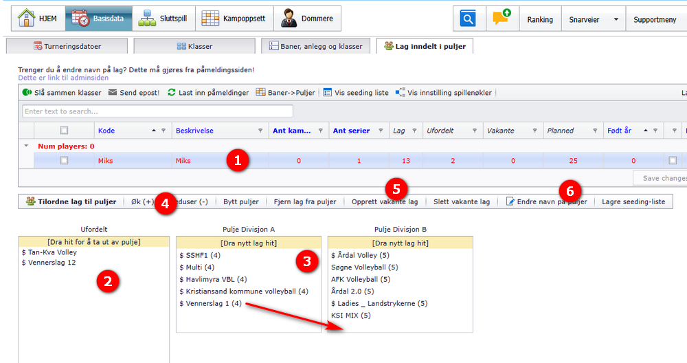 - Lag som ligger i boksen "Ufordelt" er lag som enda ikke er plassert i noen gruppe. Slike lag vil IKKE få kamper. Så du må plassere de lagene du vil ha med, i en eller annen gruppe.