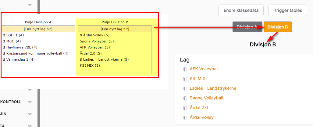 - Klikk på klassen for å se hvilke lag som er påmeldt