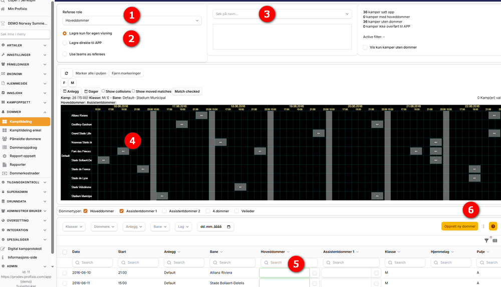 - Grafisk område hvor man ser kamper i form av bokser og hvor man kan velge kamper som skal tilordnes dommer