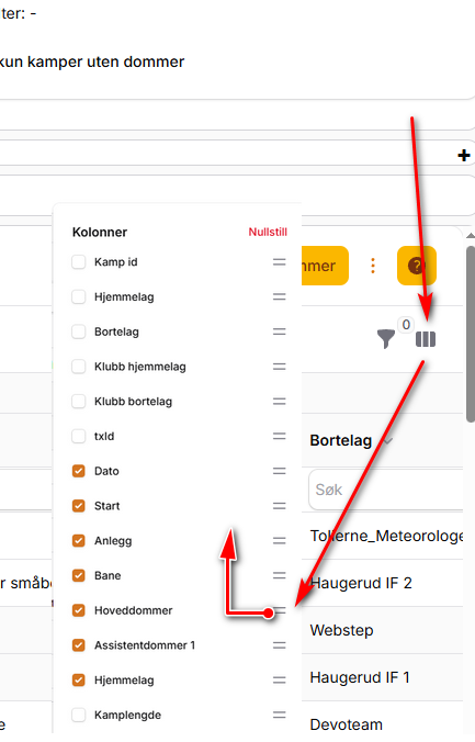 Tilordne dommere til kamper ved hjelp av listeområdet
