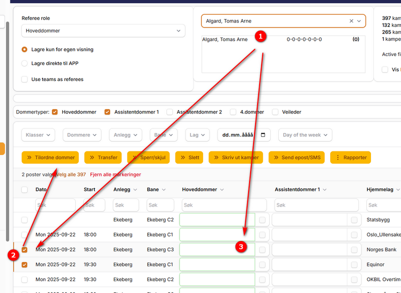 - Marker rader som du vil tilordne dommer for