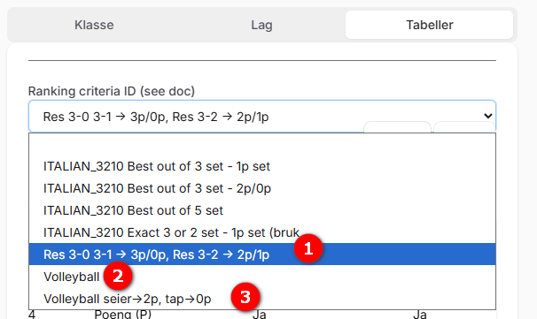3-0 gir 3 p til vinner, 0 til taper. 3-1 gir 3 p til vinner, 0 til taper. 3-2 gir 2 p til vinner, 1 til taper. - Denne er "custom-made av arrangør og bør ikke brukes av andre. Dette ser man grunnet manglende forklaring