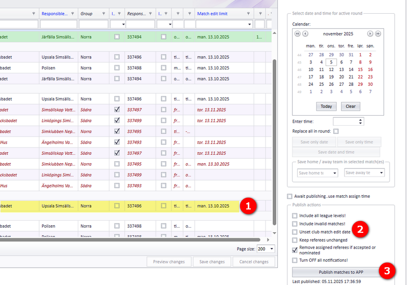 A schedule. or just some matches in a schedule, can be transferred to APP for match responsible(s) to set date, time and venue. When the club admin has set time and venue on a match, the public view is updated directly, but the match is hidden from public view until date limit for club match edit is reached. Then the match is set to visible bu automatic. Matches can have different time limit for the club admin to change matches so each match can have its own club match edit time limit. This time limit can be set when publishing matches.