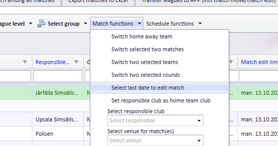 - Matches in PL are set to be unpublished. Matches must be approved (published) from PL after club admin has suggested play time and venue. Suggestions are shown in a grid in menu "Schedule".