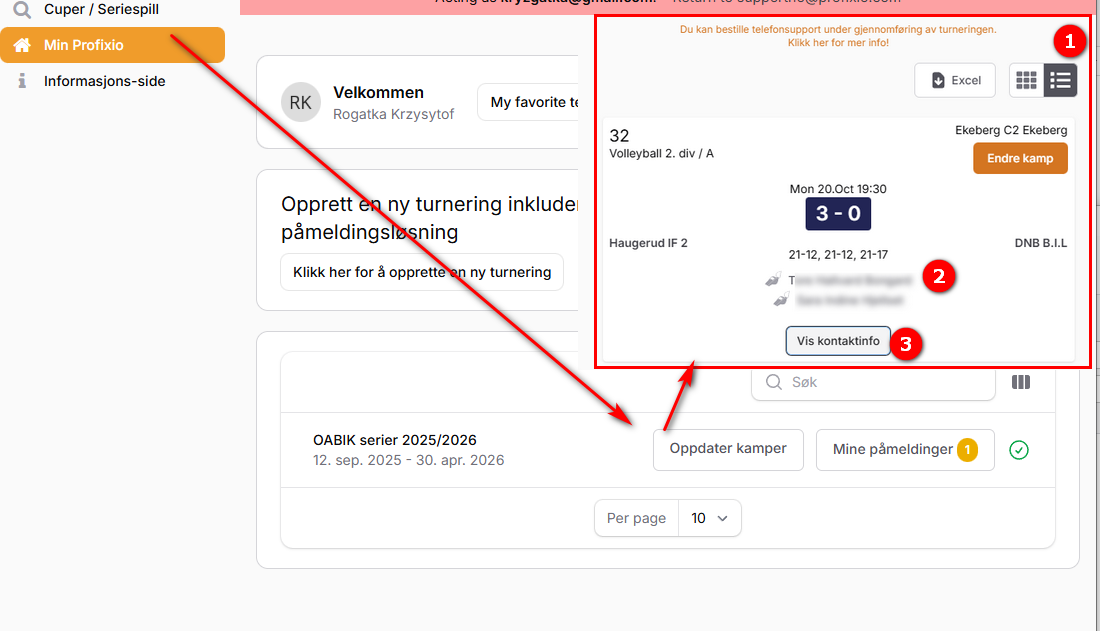 - Klikk på "Vis kontaktinfo" for å få kontaktinfo til motstanderlag