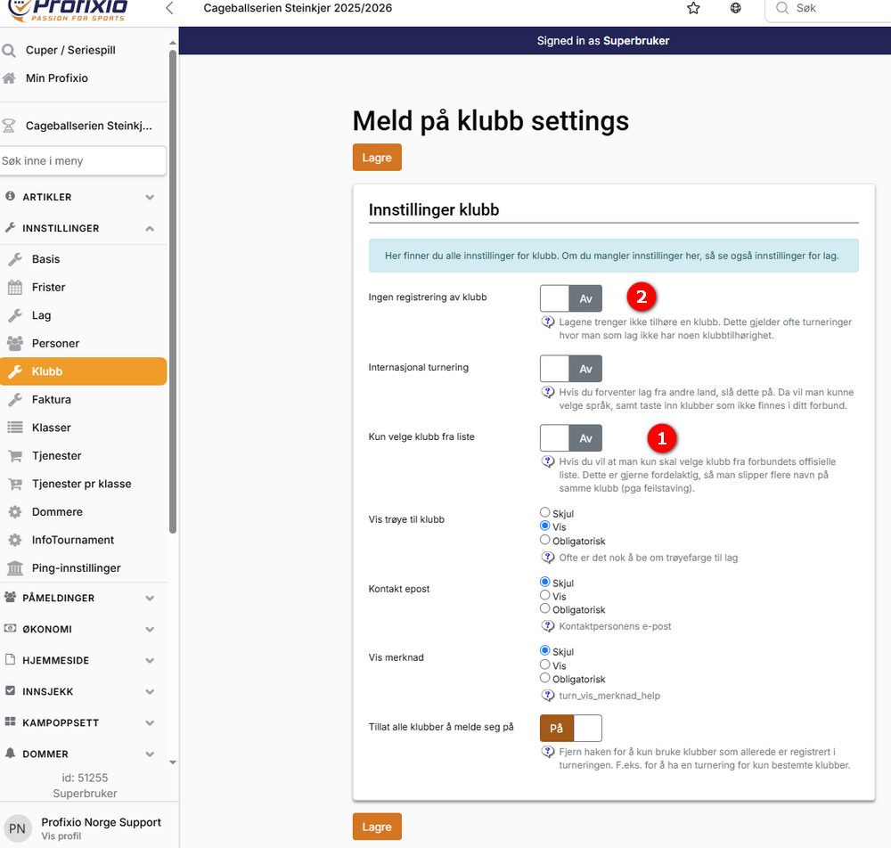 - Kun kan velge en klubb som finnes i NIF sin database. Da må man slå på bryter vist som boble 2.
