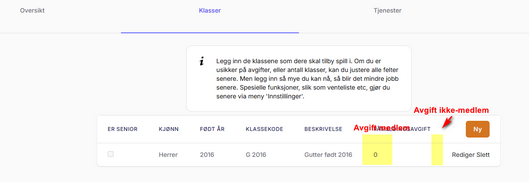 - Når man oppretter en serie, og skal taste inn data om klasser/divisjoner, så taster man inn både pris for medlem/ikke-medlem. OM det ikke er noen skilnad så tastes det kun inn pris for medlem.