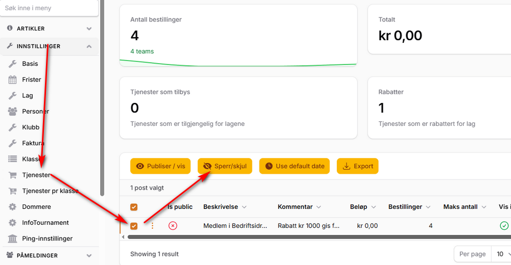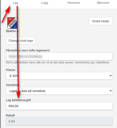 - Arrangør kan endre avgift for uansett lag, via kortet for lag: