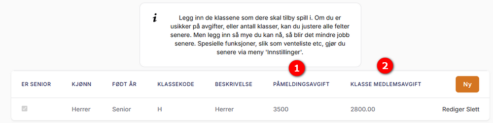 - Når man oppretter en serie, og skal taste inn data om klasser/divisjoner, så taster man inn både pris for medlem/ikke-medlem. Om det ikke er noen skilnad, så tastes det kun inn pris "Påmeldingsavgift".