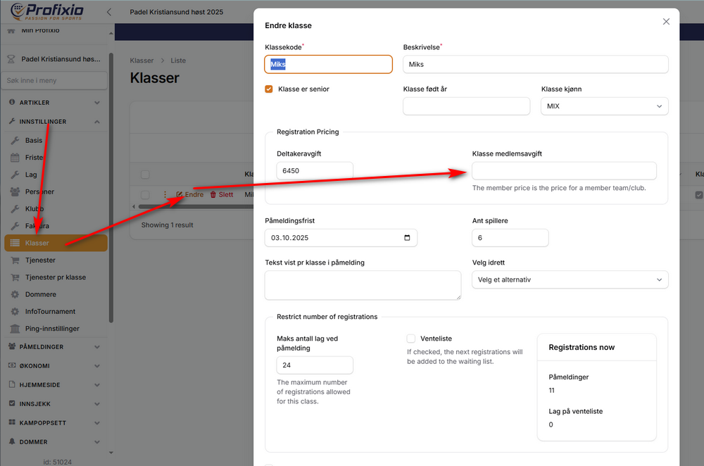 - Først må man sette rett medlemspris for klassen via meny Innstillinger - Klasser. Husk å lagre!