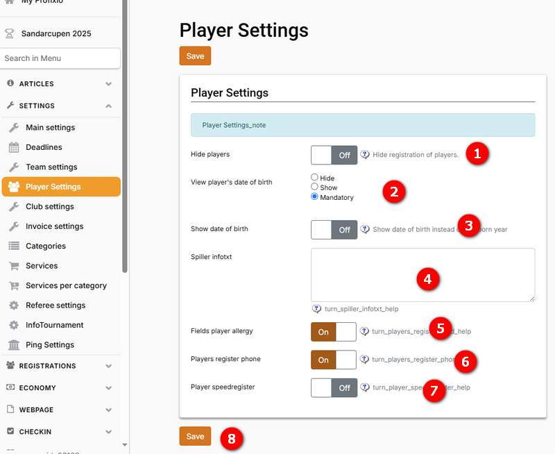 - Player registration is shown as default. You can hide this field if you do not need team leaders to register players.