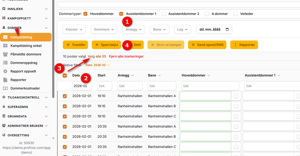 Som standard: Om man flytter en kamp, vil alle dommere som er tilordnet kampen tas bort. Dommere må da tilordnes på nytt.
