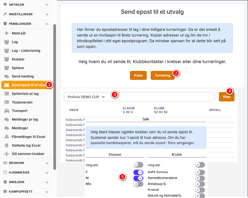 - Bruk "Filter" for å filtrere på klasser og eller klubber.