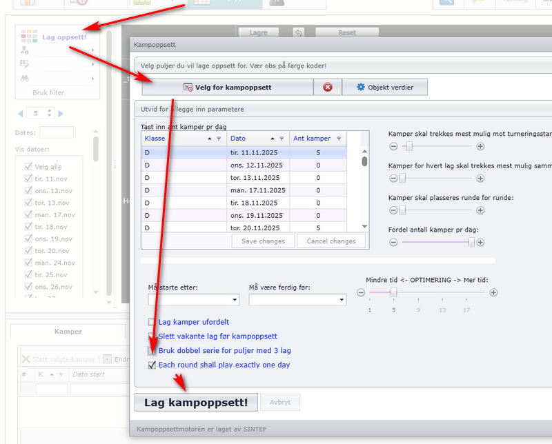 Gå som vanlig inn i meny "Kampoppsett". Klikk så "Lag oppsett". Velg Klassen/gruppen og dertter marker for "Hver runde skal spilles på en dag".