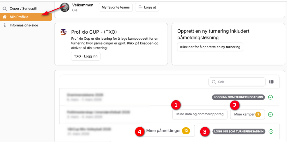 - "Logg inn som turneringsadmin" vil vises om du har rettigheter på høyeste nivå for turneringen.